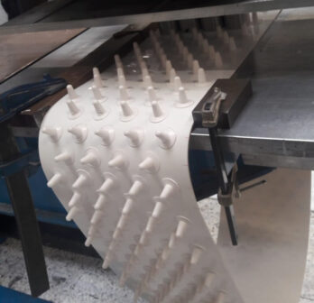 Los perfiles "dedos" y "tetones" son especialmente indicados en el transporte inclinado de frutas y verduras para evitar golpes bruscos que puedan dañar su aspecto. En el taller de esbelt® soldamos en las bandas los "dedos" (con un paso mínimo de 100mm) y los "tetones" (con un paso mínimo de 51mm entre centros) según las necesidades de las aplicaciones.